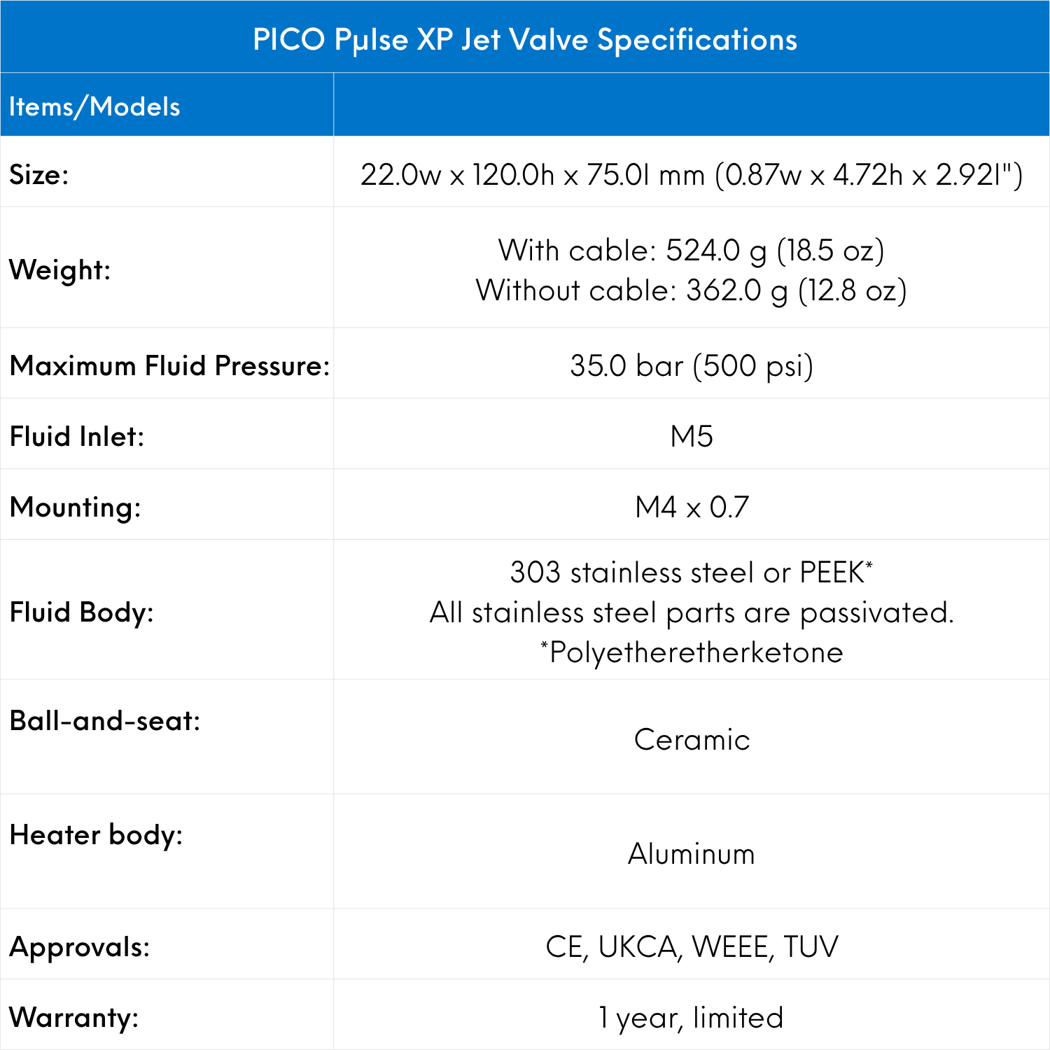 | 7364876 | PICO Pμlse XP Jet Valve HD | • For greater dispensing repeatability and ability to fine tune jetting performance. |