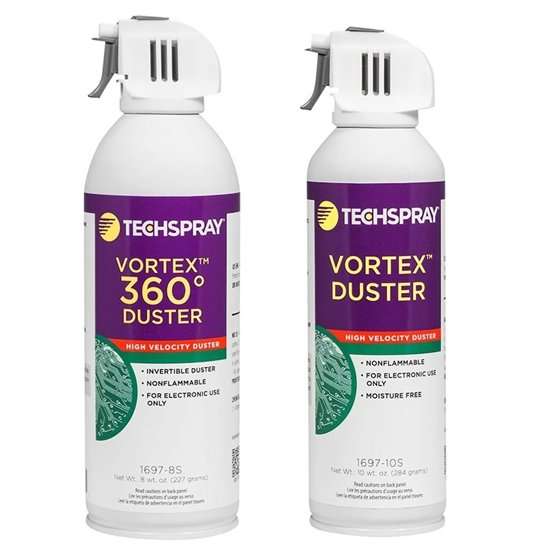 High velocity, nonflammable compressed air duster blast away dust and dirt. Vortex 360° (1697-8S) can be sprayed while tilted in any direction without dispensing liquid.